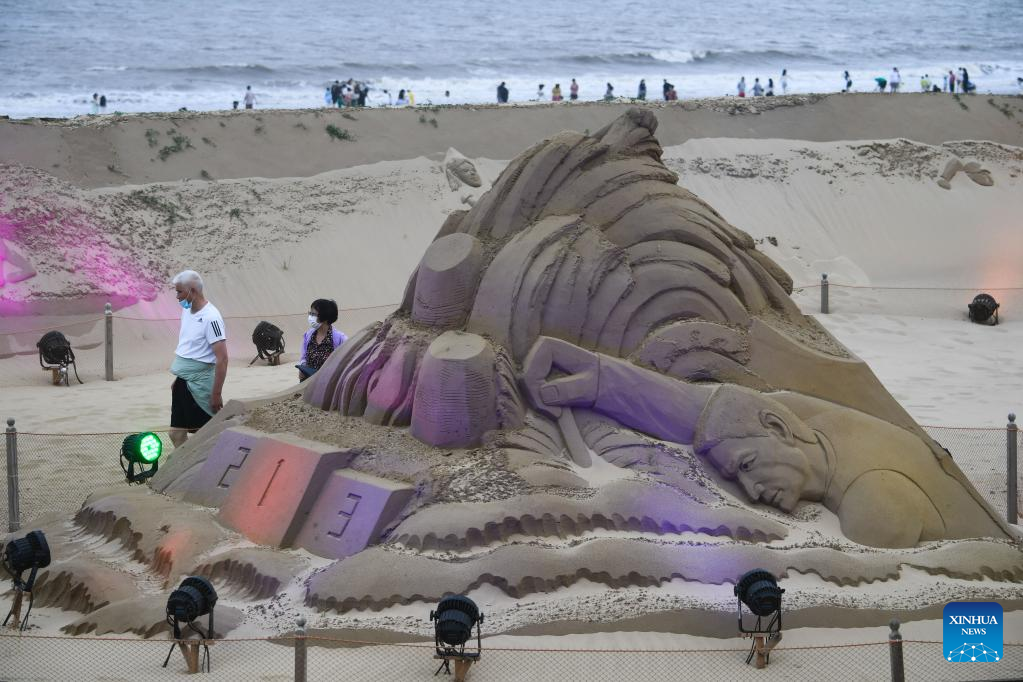 People visit the sand sculpture display zone in Zhoushan, east China's Zhejiang Province, June 28, 2022. The 23rd Zhoushan International Sand Sculpture Festival opened here recently, with over 60 sand sculptures greeting the public. (Xinhua/Xu Yu)