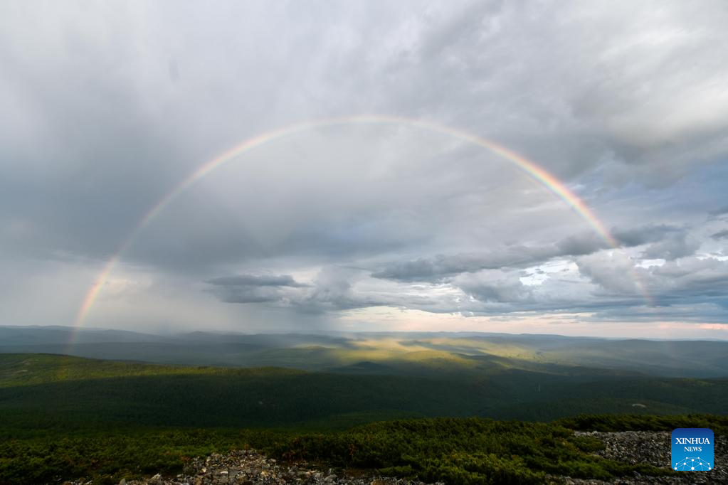 Photo taken on June 28, 2022 shows the rainbow at Okliet Mountain in Genhe City, north China's Inner Mongolia Autonomous Region. (Xinhua/Wang Zecong)