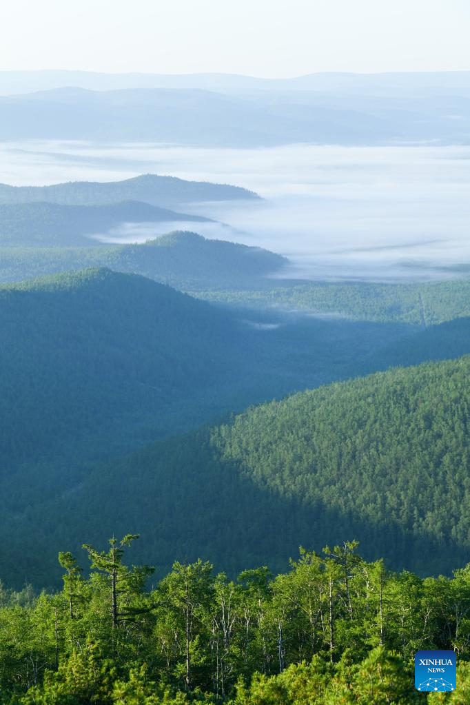 Photo taken on June 29, 2022 shows the morning fog at Okliet Mountain in Genhe City, north China's Inner Mongolia Autonomous Region. (Xinhua/Bei He)
