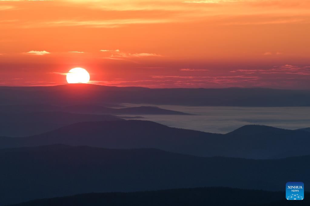 Photo taken on June 29, 2022 shows the sunrise at Okliet Mountain in Genhe City, north China's Inner Mongolia Autonomous Region. (Xinhua/Bei He)