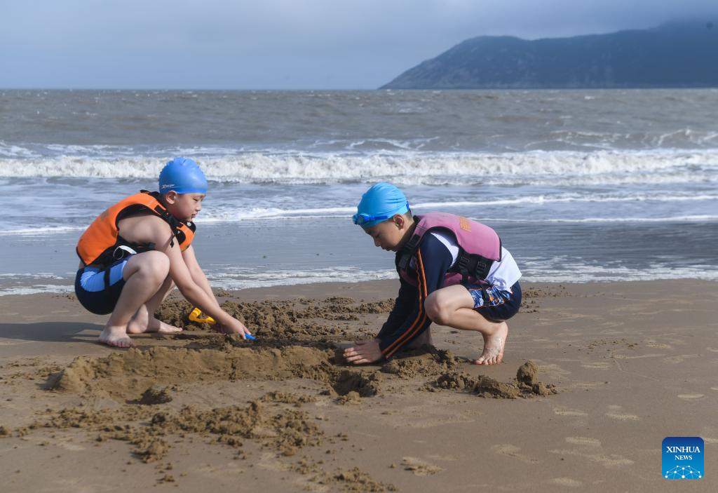 Children play on the beach in Zhujiajian scenic spot in Zhoushan, east China's Zhejiang Province, June 28, 2022. The Zhujiajian scenic spot saw a steady recovery of tourism this summer. (Xinhua/Xu Yu)