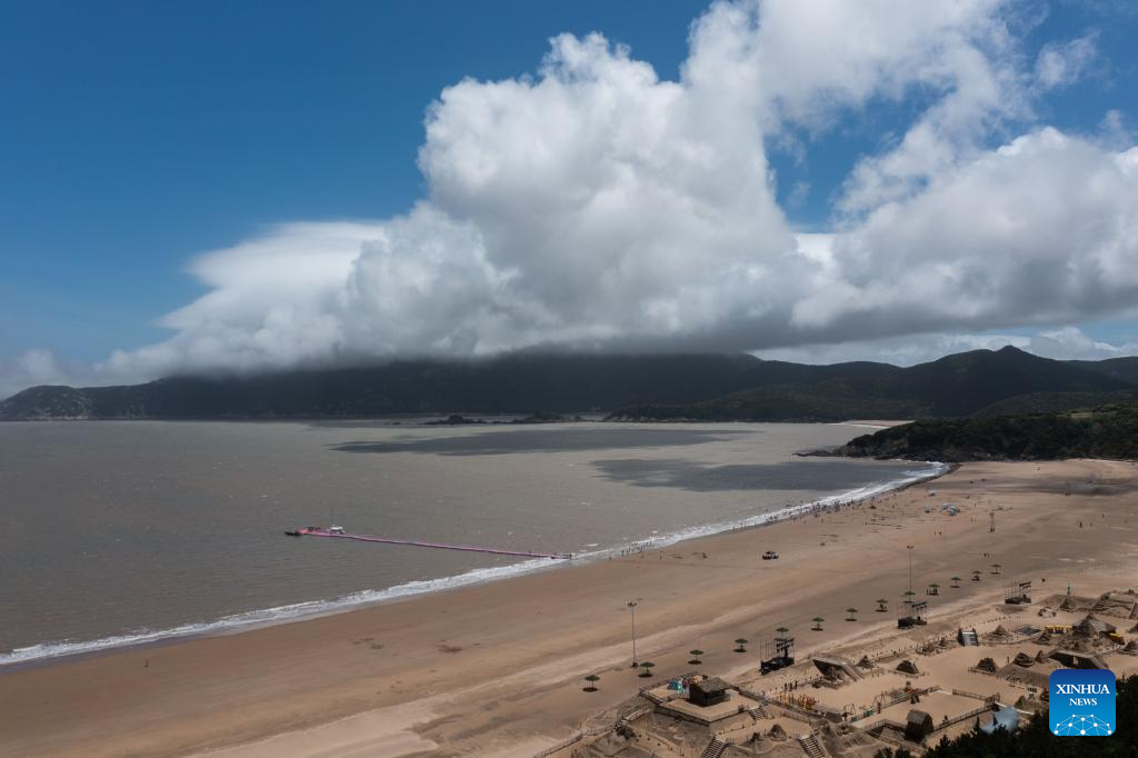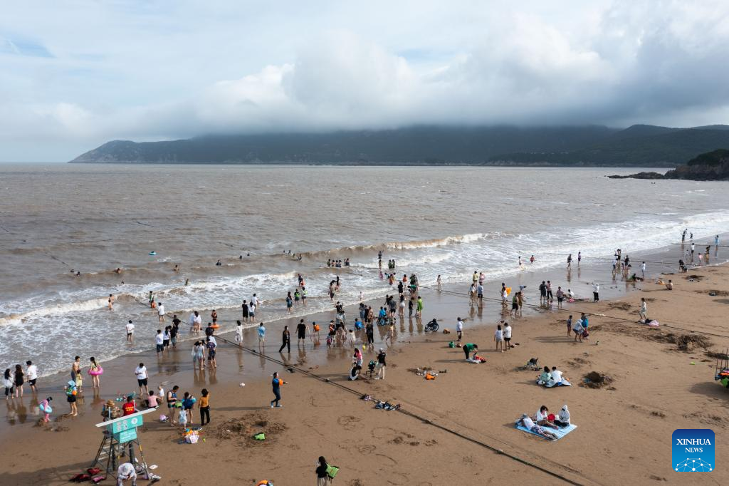 Tourists play on the beach in Zhujiajian scenic spot in Zhoushan, east China's Zhejiang Province, June 28, 2022. The Zhujiajian scenic spot saw a steady recovery of tourism this summer. (Xinhua/Xu Yu)