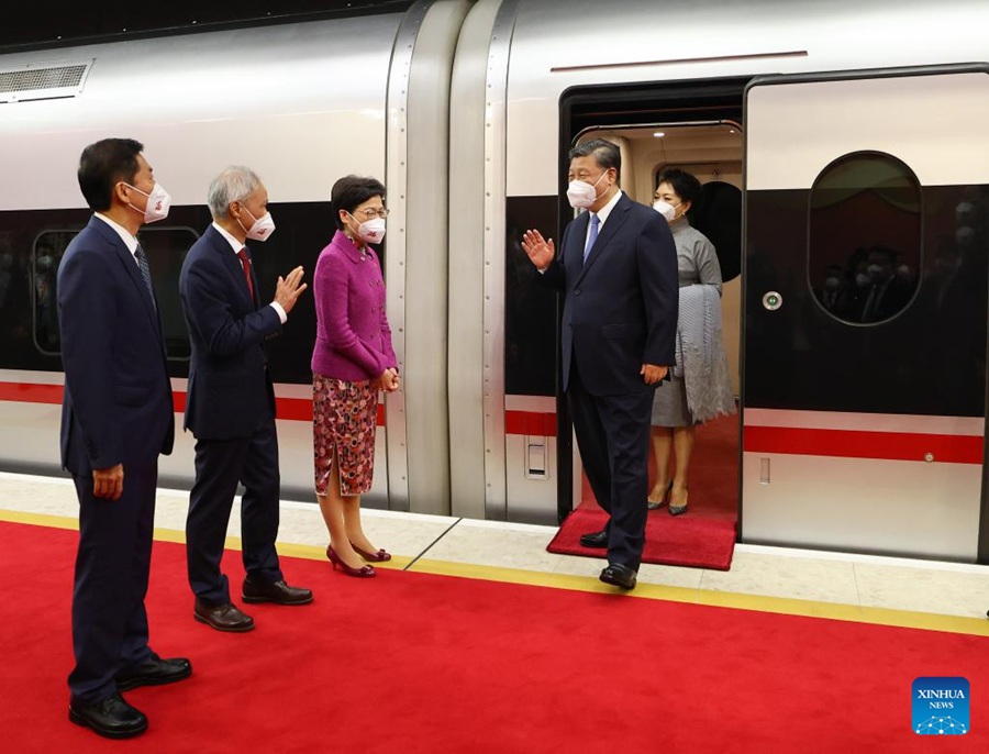 Chinese President Xi Jinping congratulates the Hong Kong compatriots and extends his best wishes on the occasion marking the 25th anniversary of Hong Kong's return to the motherland upon his arrival in Hong Kong, south China, June 30, 2022. Xi, also general secretary of the Communist Party of China Central Committee and chairman of the Central Military Commission, arrived in Hong Kong by train on Thursday afternoon. Xi will attend a meeting celebrating the 25th anniversary of Hong Kong's return to the motherland and the inaugural ceremony of the sixth-term government of the Hong Kong Special Administrative Region (HKSAR) on July 1. He will also inspect the HKSAR. (Xinhua/Yue Yuewei)