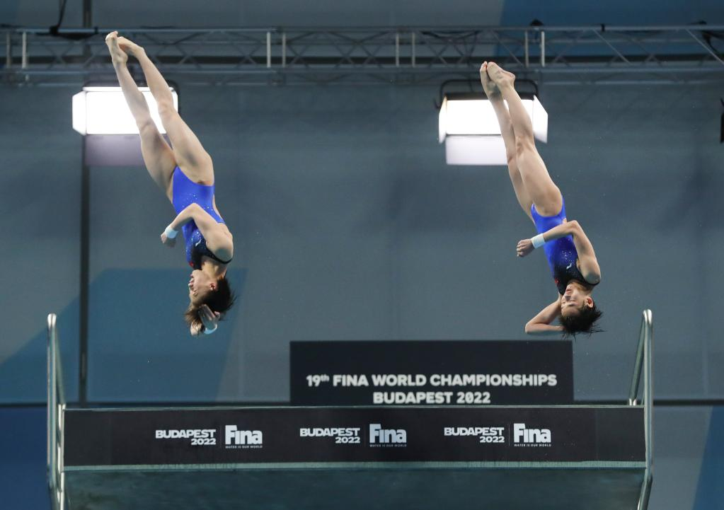 Chen Yuxi (L)/Quan Hongchan of China compete during the women's 10m synchronised final of diving at the 19th FINA World Championships in Budapest, Hungary, June 30, 2022. (Xinhua/Zheng Huansong)