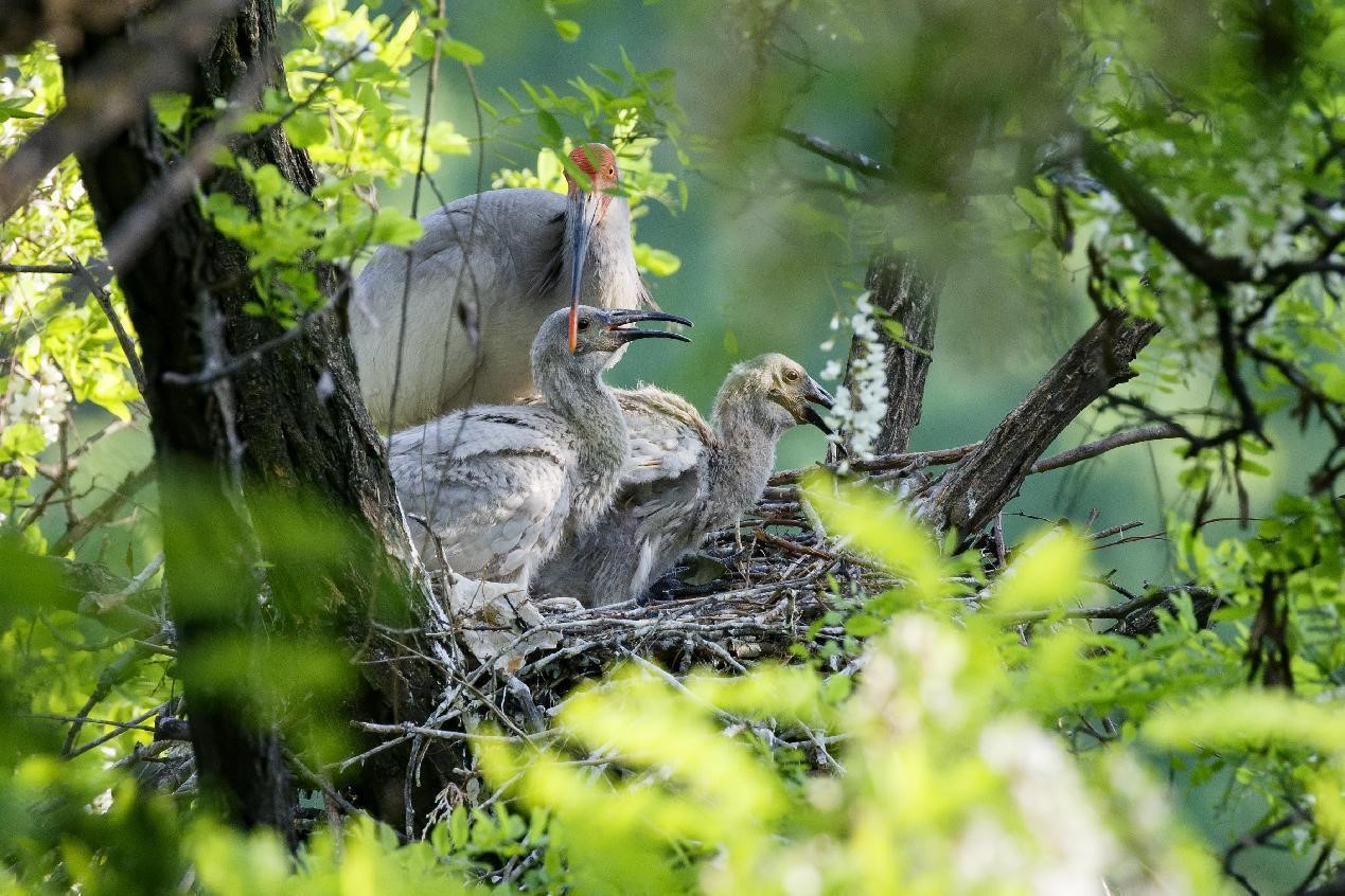 An adult crested ibis and two young birds rest on a tree near the Juhe River, Yaozhou district, Tongchuan, northwest China’s Shaanxi province, May 6, 2022. (People's Daily Online/Shi Tonggang)