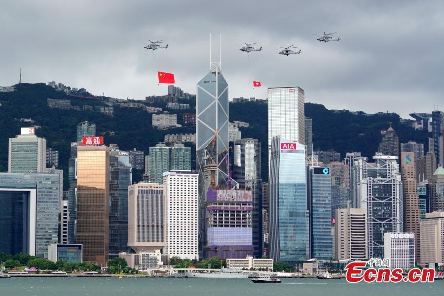 Helicopters with Chinese national flag and the flag of the Hong Kong Special Administrative Region fly over the Victoria Harbor to celebrate the 25th anniversary of Hong Kong's return to the motherland, Hong Kong, July 1, 2922. (Photo: China News Service/Zhang Wei)