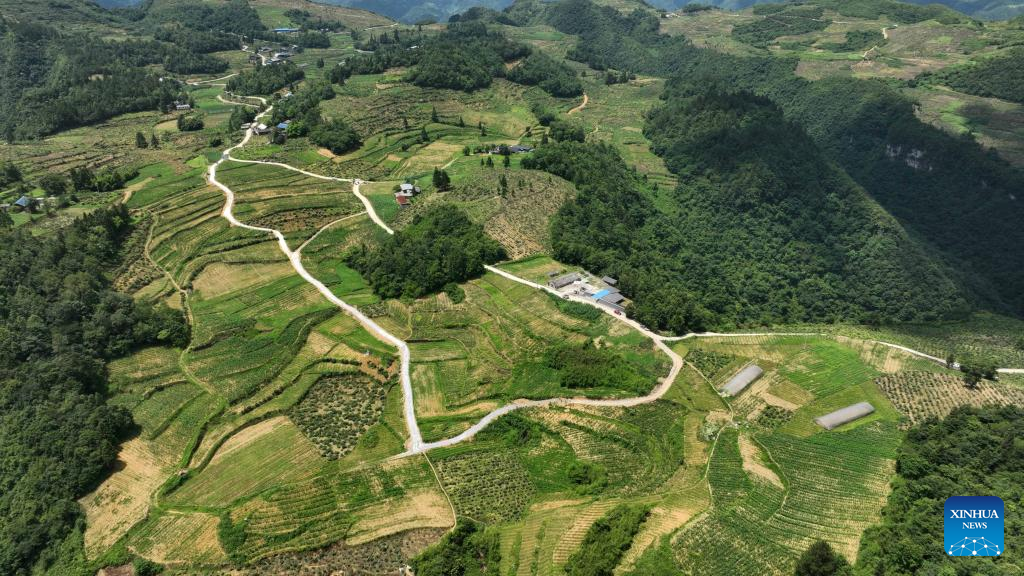 Aerial photo taken on July 1, 2022 shows a honeysuckle plantation base in Suiyang County, southwest China's Guizhou Province. The local government has been making efforts in developing industries related with honeysuckle, which has entered its harvest season lately. (Xinhua/Yang Ying)