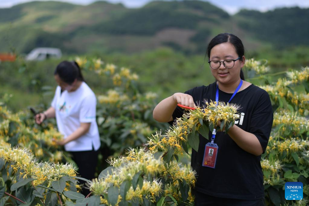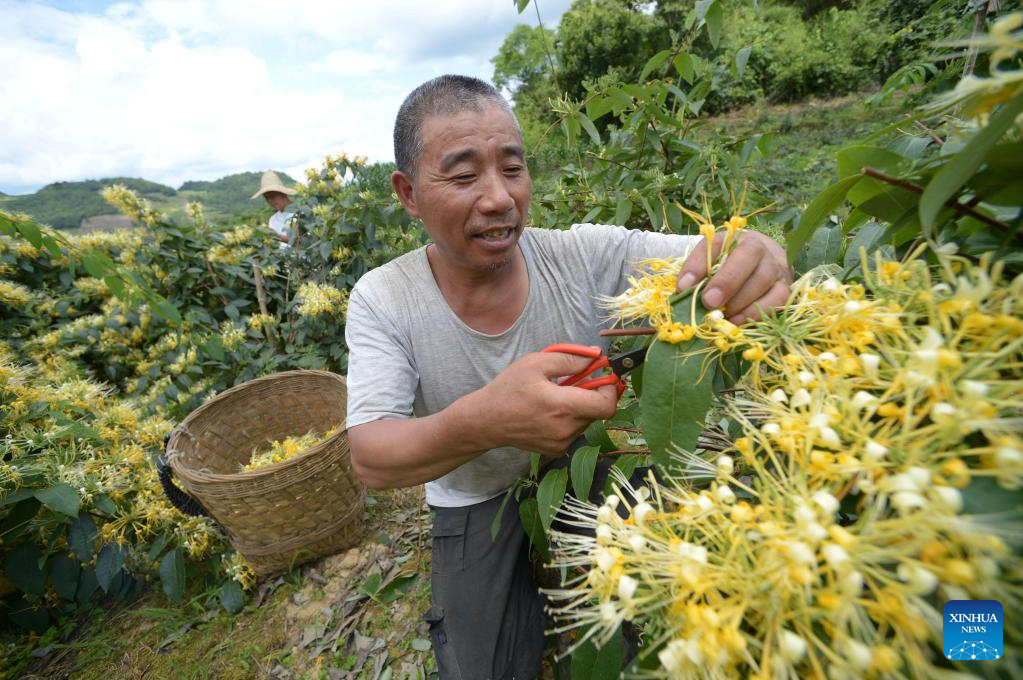Local people harvest honeysuckle at a plantation base in Suiyang County, southwest China's Guizhou Province, July 1, 2022. The local government has been making efforts in developing industries related with honeysuckle, which has entered its harvest season lately. (Xinhua/Yang Ying)