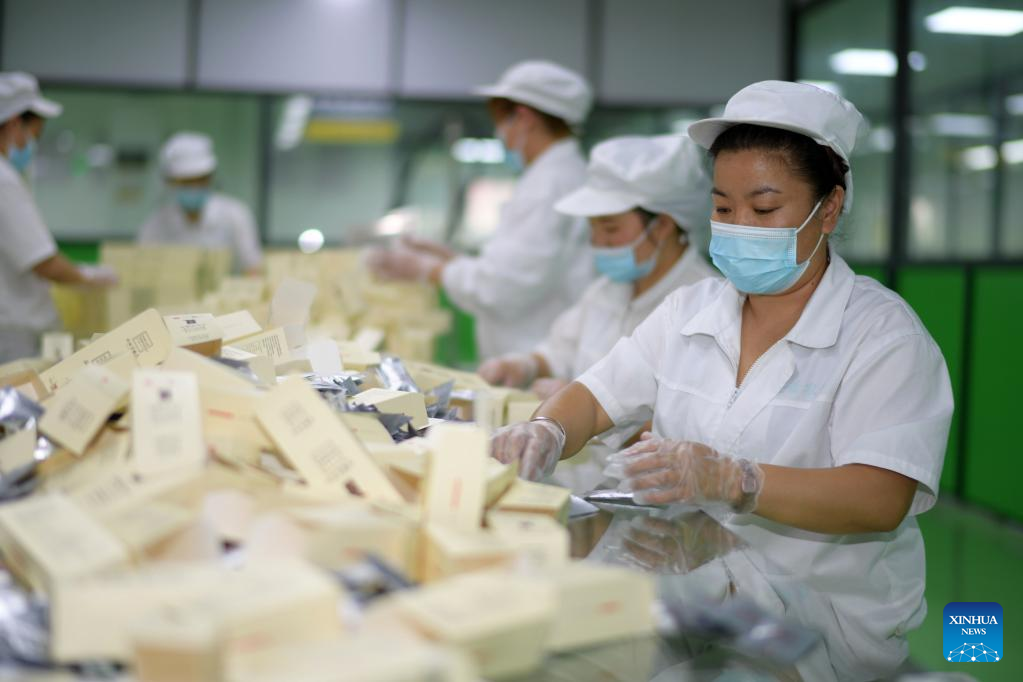 Workers pack tea products made of honeysuckle at a plant in Suiyang County, southwest China's Guizhou Province, July 1, 2022. The local government has been making efforts in developing industries related with honeysuckle, which has entered its harvest season lately. (Xinhua/Yang Ying)