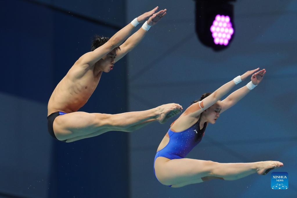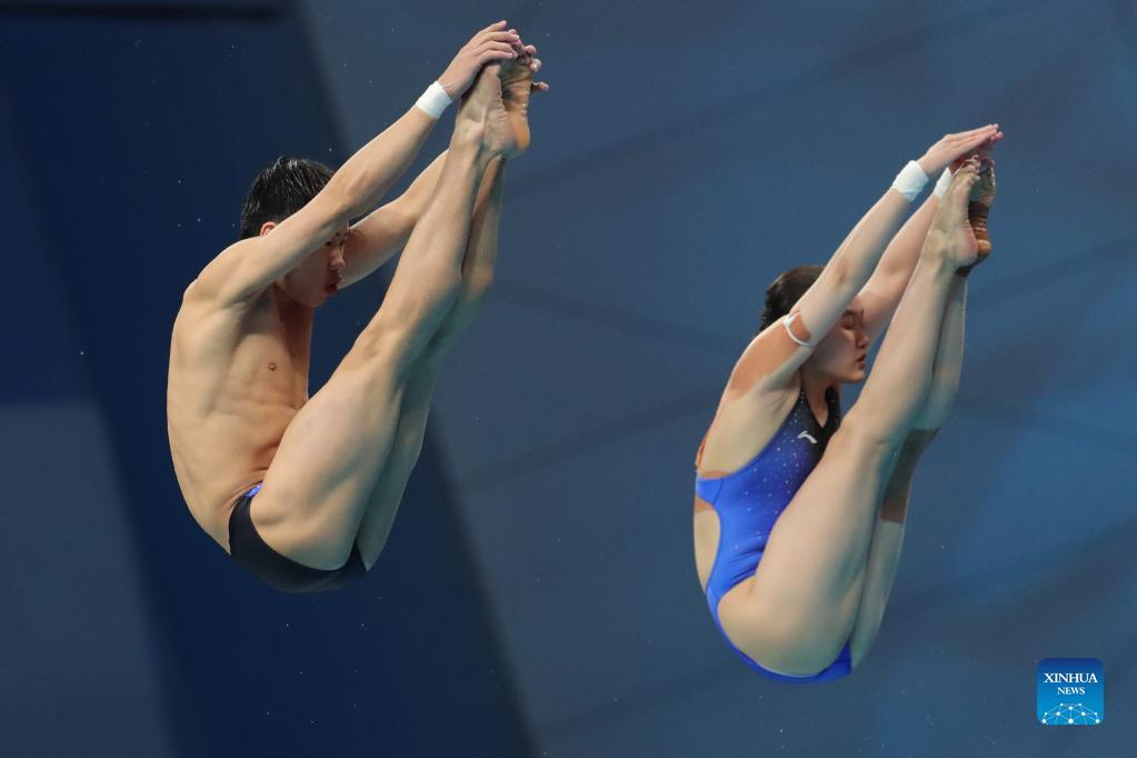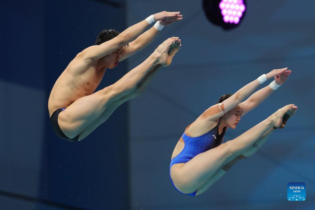 Ren Qian (R) and Duan Yu of China compete during the mixed 10m synchronised final of diving at the 19th FINA World Championships in Budapest, Hungary, July 1, 2022. (Xinhua/Zheng Huansong)