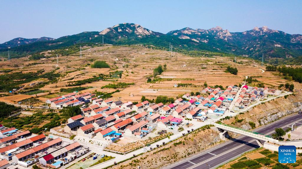 Aerial photo taken on June 18, 2022 shows a view of Hongniya Village in Wulian County of Rizhao, east China's Shandong Province. Hongniya Village used to be a poverty-stricken village. In recent years, village cadre Zhang Shouying has taken a series of measures to help the villagers get rid of poverty and live a better life. In 2021, under the professional guidance of Shandong Agricultural University, Hongniya Village developed the cultivation of edible fungi, which has helped increase villagers' income and boost rural revitalization. (Xinhua/Guo Xulei)