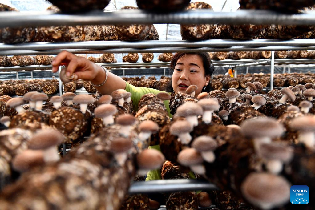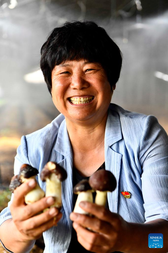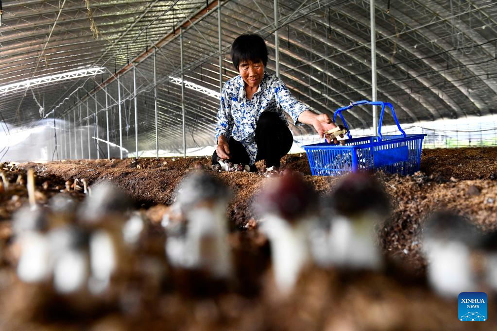 A villager picks edible fungi at a greenhouse in Hongniya Village in Wulian County of Rizhao, east China's Shandong Province, June 17, 2022. Hongniya Village used to be a poverty-stricken village. In recent years, village cadre Zhang Shouying has taken a series of measures to help the villagers get rid of poverty and live a better life. In 2021, under the professional guidance of Shandong Agricultural University, Hongniya Village developed the cultivation of edible fungi, which has helped increase villagers' income and boost rural revitalization. (Xinhua/Guo Xulei)