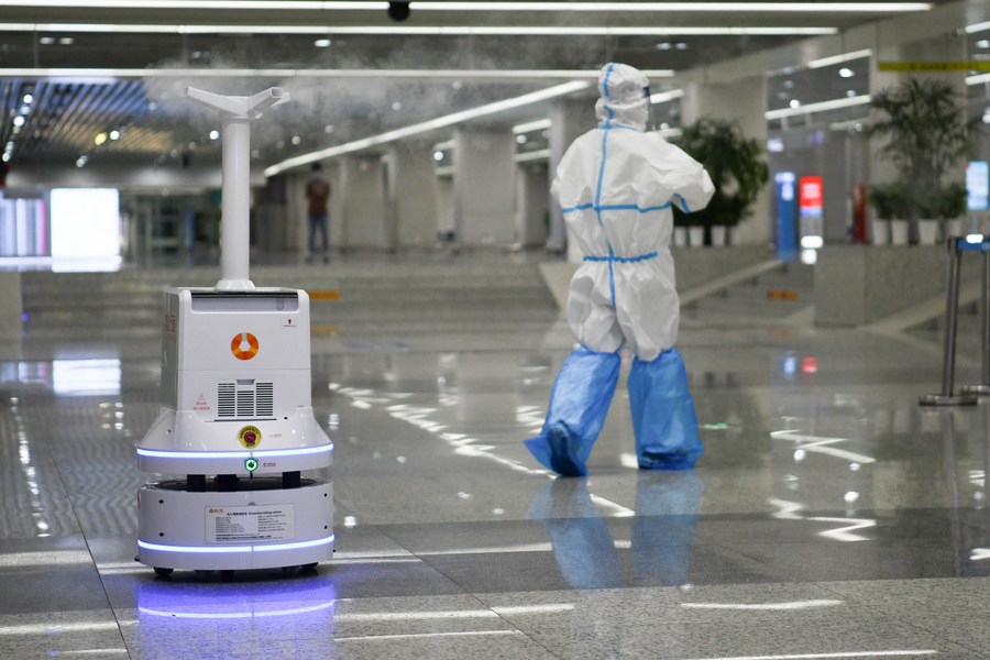 An unmanned disinfection device works in Hefei South Railway Station in Hefei, east China's Anhui Province, April 27, 2022. (Xinhua/Zhang Duan)