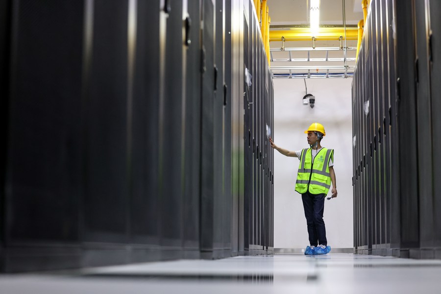A staff member checks equipment at a data center of China Mobile in southwest China's Guizhou Province, May 24, 2022. (Xinhua/Ou Dongqu)