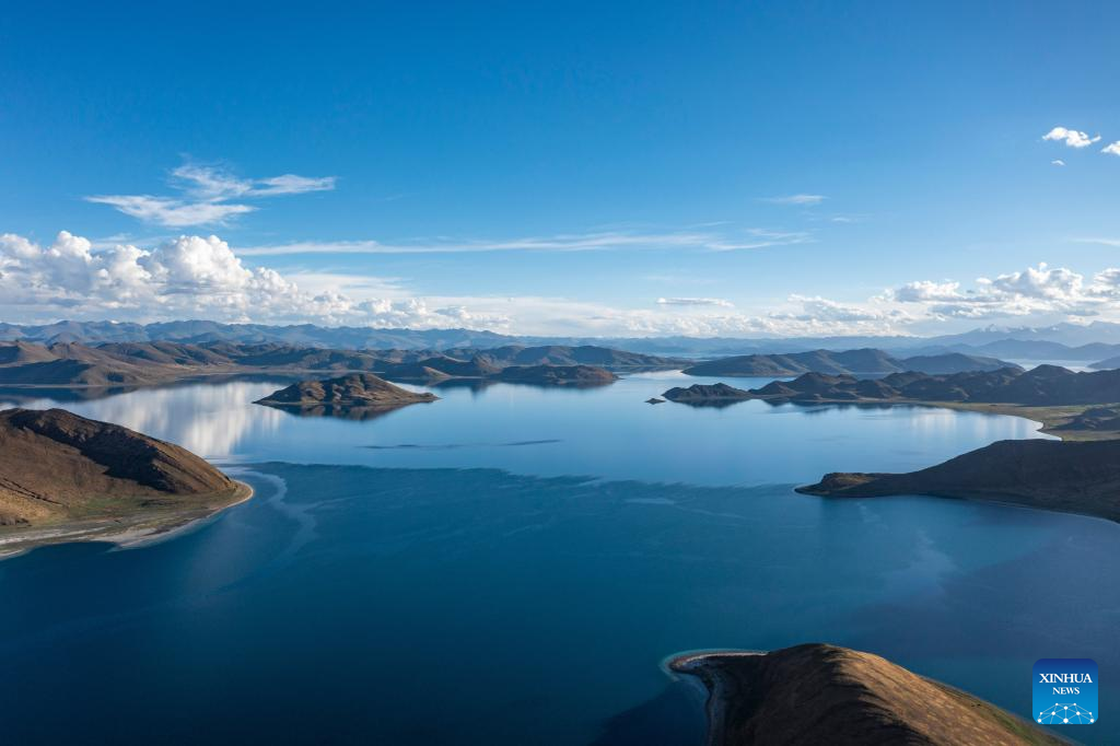 Photo taken on July 2, 2022 shows the scenery of the Yamdrok Lake in Nagarze County of Shannan City, southwest China's Tibet Autonomous Region. (Xinhua/Sun Fei)