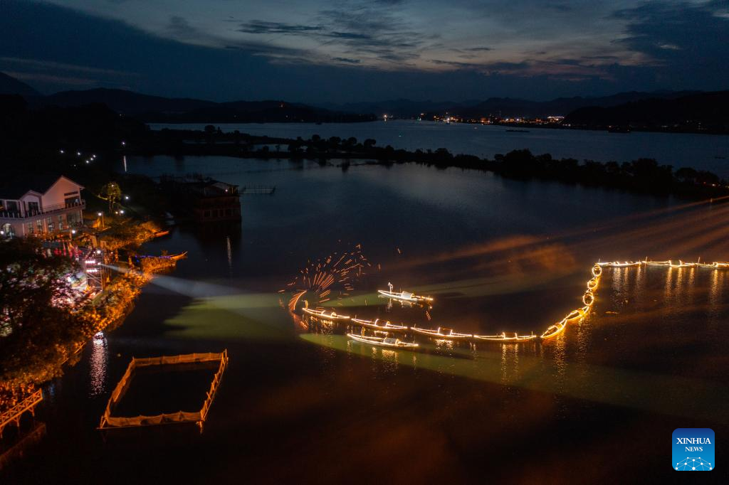 People enjoy night view during a folk festival in Sandu Fishing Village of Jiande City, east China's Zhejiang Province, July 3, 2022. (Xinhua/Xu Yu)