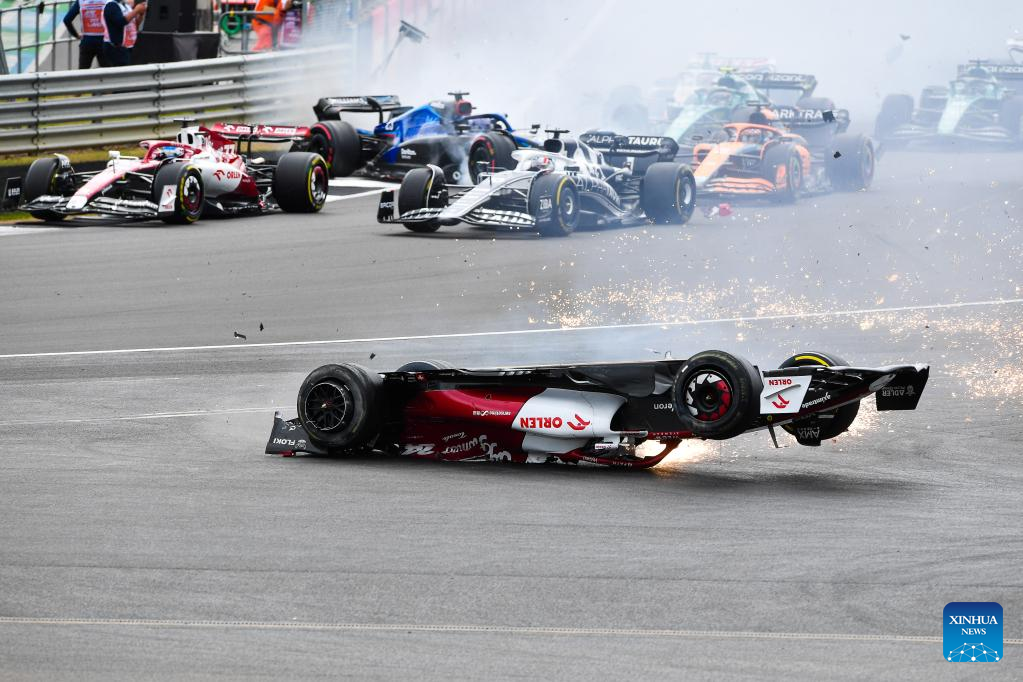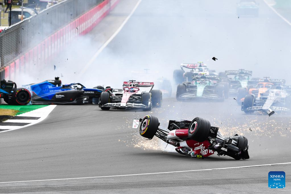 Alfa Romeo's Chinese driver Zhou Guanyu crashes out at the start of the Formula One British Grand Prix at the Silverstone motor racing circuit in Silverstone, Britain, on July 3, 2022. (Photo by Qian Jun/Xinhua)