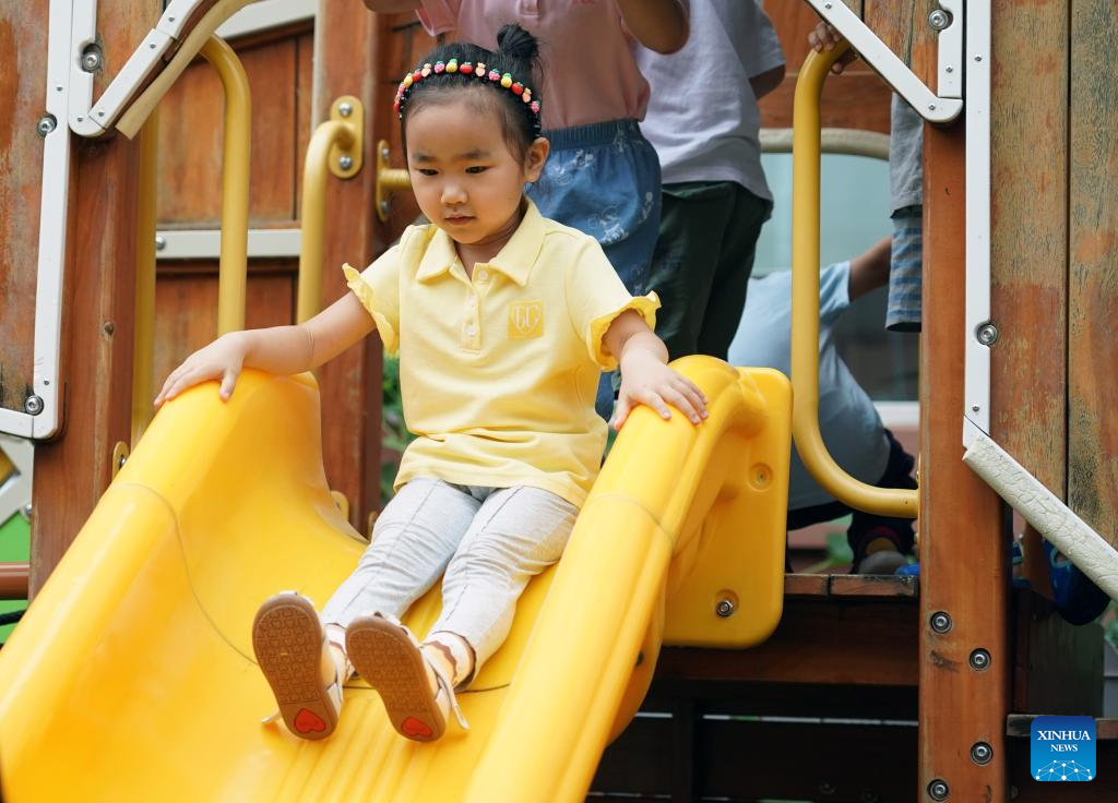 A child plays outdoor as a kindergarten reopens in Beijing, capital of China, July 4, 2022. Kindergartens in Beijng reopened on Monday. (Xinhua/Ren Chao)
