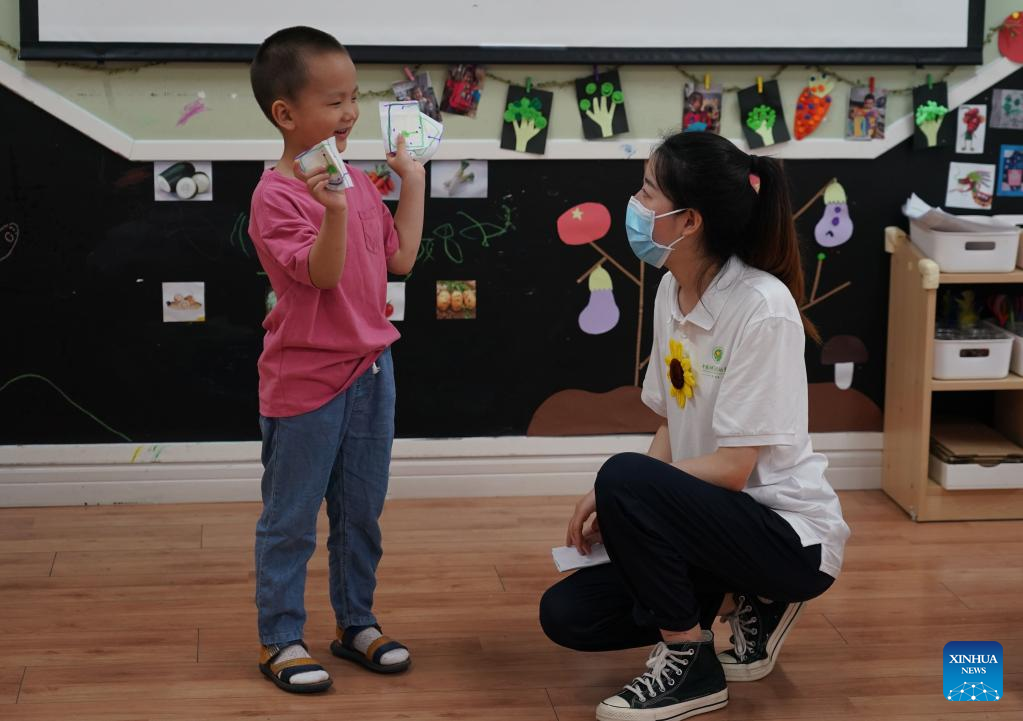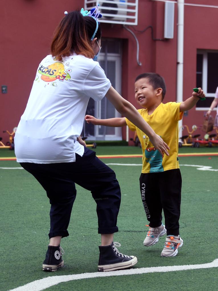 A child interacts with his teacher as a kindergarten reopens in Beijing, capital of China, July 4, 2022. Kindergartens in Beijng reopened on Monday. (Xinhua/Ren Chao)