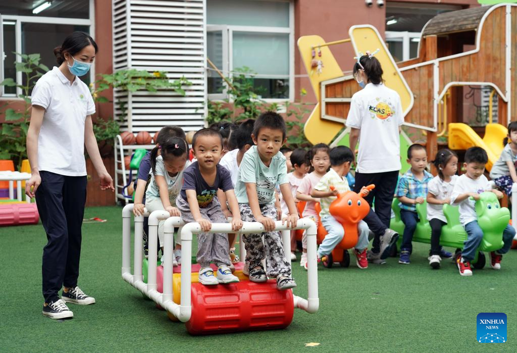 Children play outdoor as a kindergarten reopens in Beijing, capital of China, July 4, 2022. Kindergartens in Beijng reopened on Monday. (Xinhua/Ren Chao)