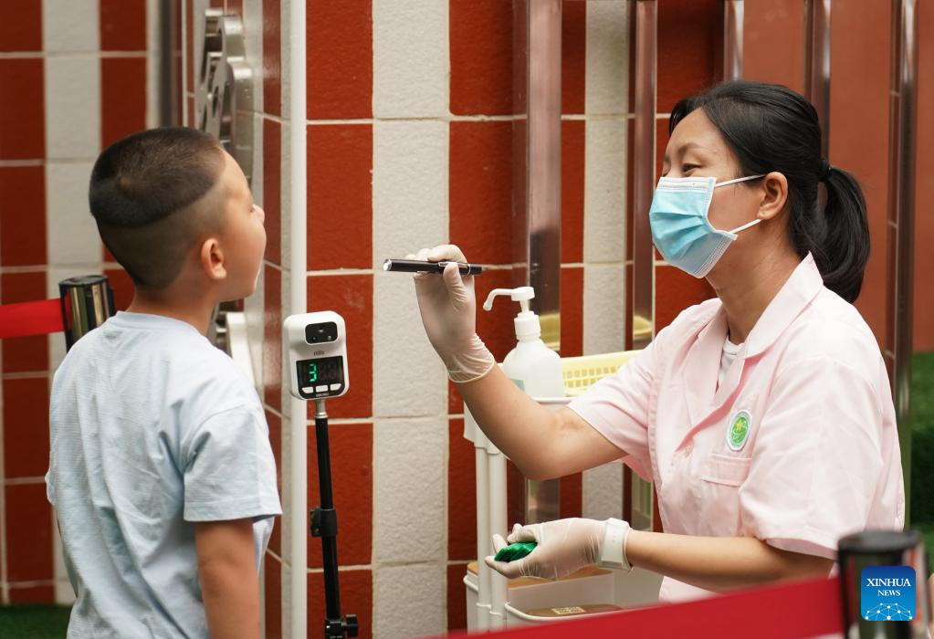 A doctor conducts morning check for a child as a kindergarten reopens in Beijing, capital of China, July 4, 2022. Kindergartens in Beijng reopened on Monday. (Xinhua/Ren Chao)