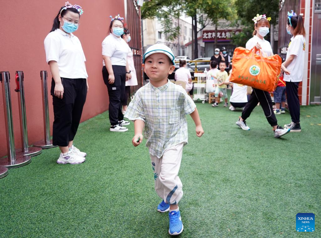 A child enters the campus as a kindergarten reopens in Beijing, capital of China, July 4, 2022. Kindergartens in Beijng reopened on Monday. (Xinhua/Ren Chao)
