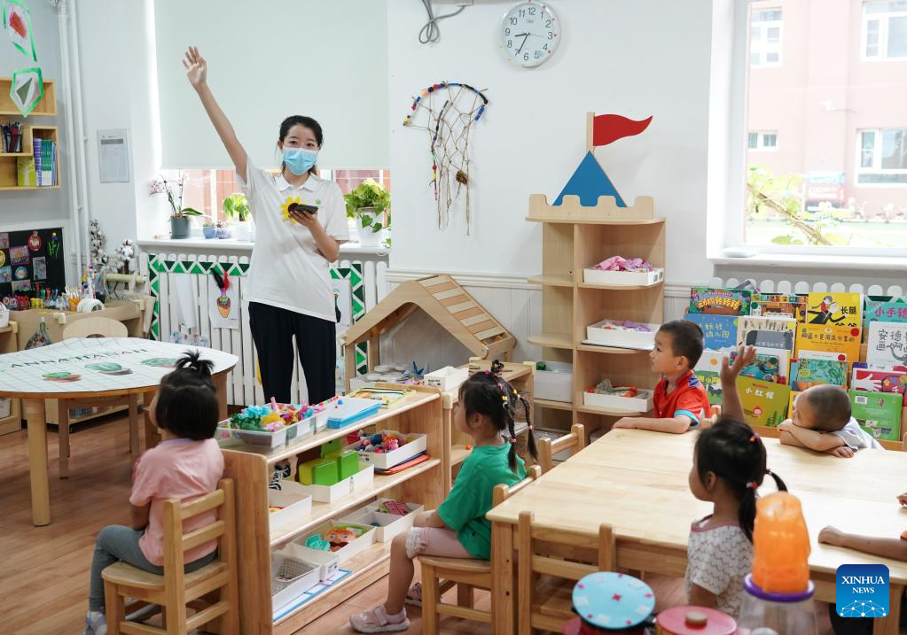 Children take part in activities as a kindergarten reopens in Beijing, capital of China, July 4, 2022. Kindergartens in Beijng reopened on Monday. (Xinhua/Ren Chao)