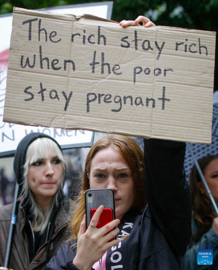 People participate in an abortion rights rally outside Vancouver Art Gallery in Vancouver, British Columbia, Canada, on July 4, 2022. (Photo by Liang Sen/Xinhua)