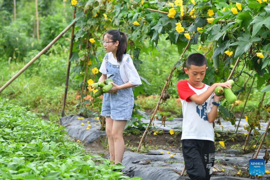 Children pick towel gourds at a base to experience agrarian culture in Tongzi Village of Xiangtan City, central China's Hunan Province, July 4, 2022. (Xinhua/Chen Zeguo)