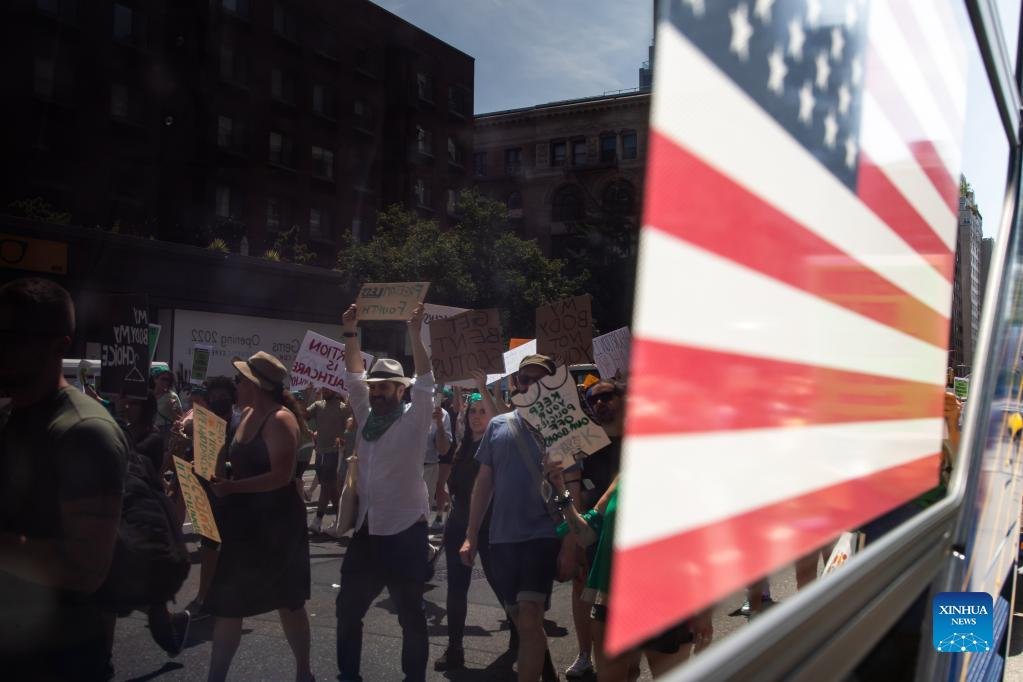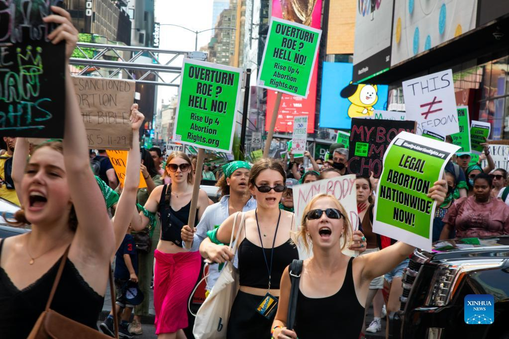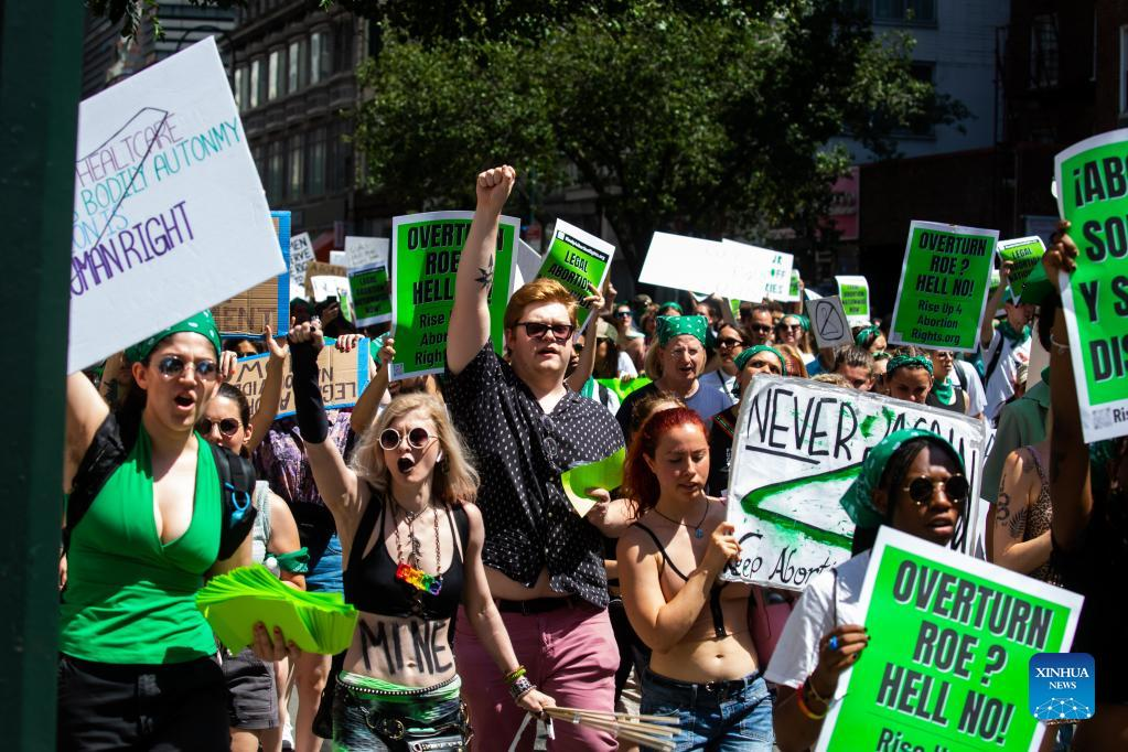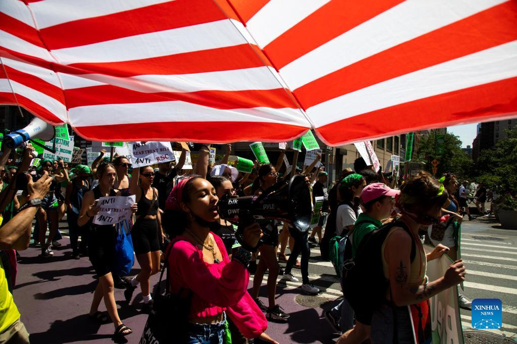 Demonstrators march during a protest against the Supreme Court's overturning of the Roe v. Wade abortion-rights ruling in New York, the United States, July 4, 2022. The U.S. Supreme Court on June 24 overturned Roe v. Wade, a landmark decision that established a constitutional right to abortion in the nation nearly half a century ago. (Photo by Michael Nagle/Xinhua)