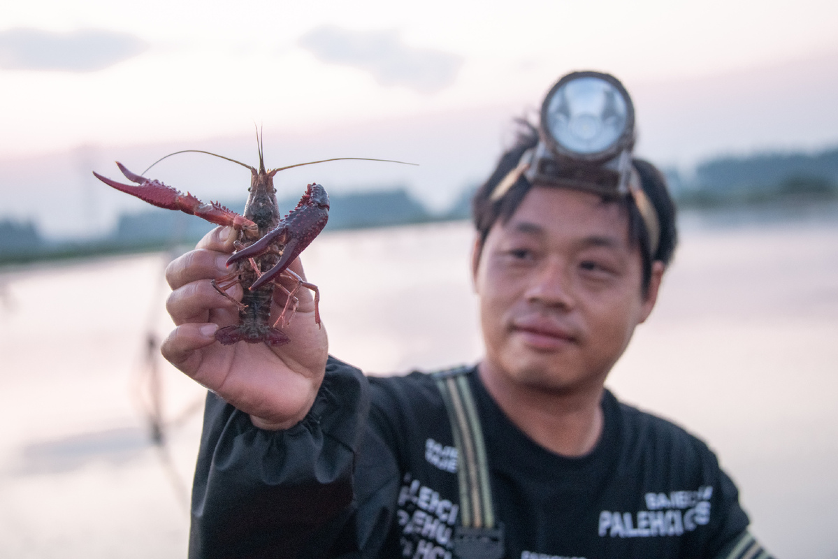 A breeder displays a crayfish at a farm in Qianjiang, Hubei province, June 25, 2022. [Photo/Xinhua]
