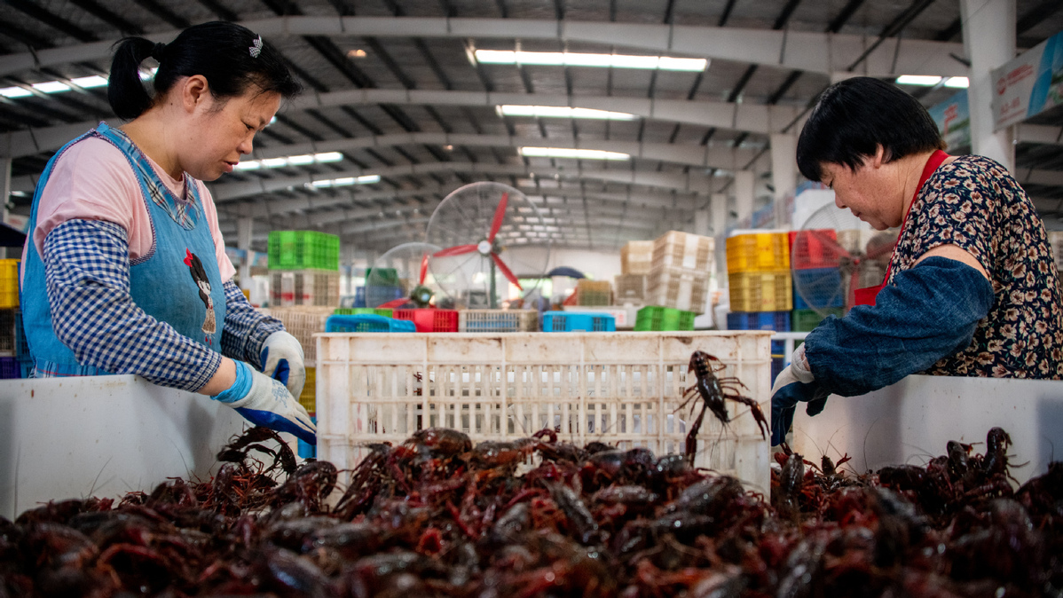Workers package crayfish at a crayfish trading center in Qianjiang, Hubei province, June 25, 2022. [Photo/Xinhua]