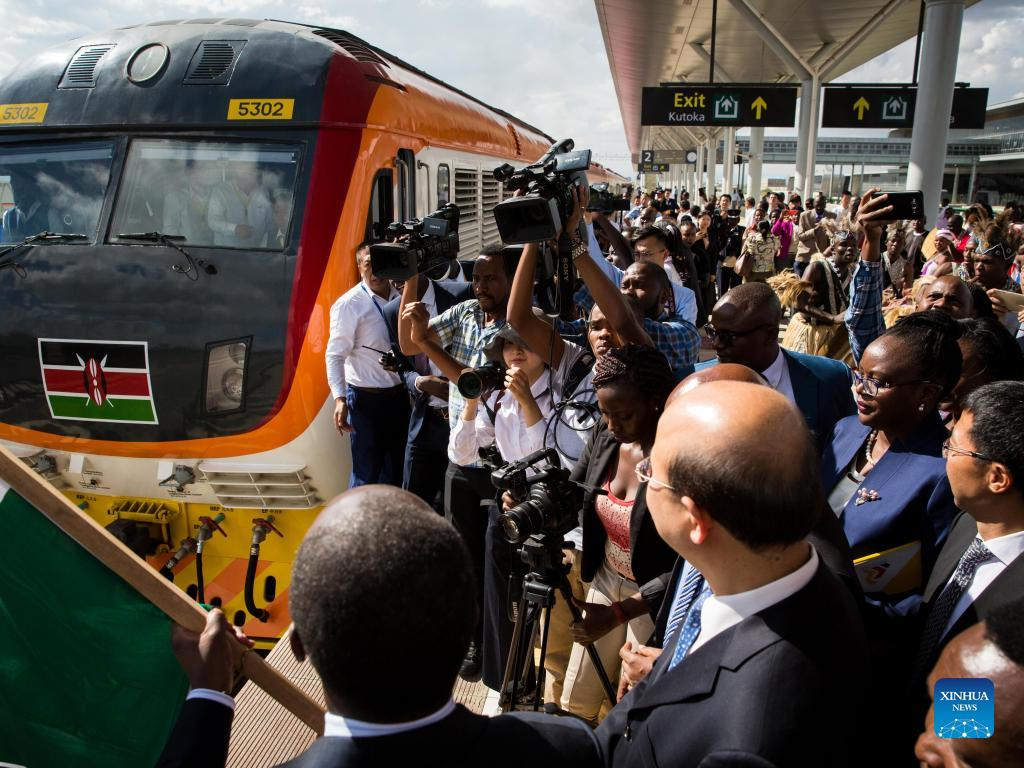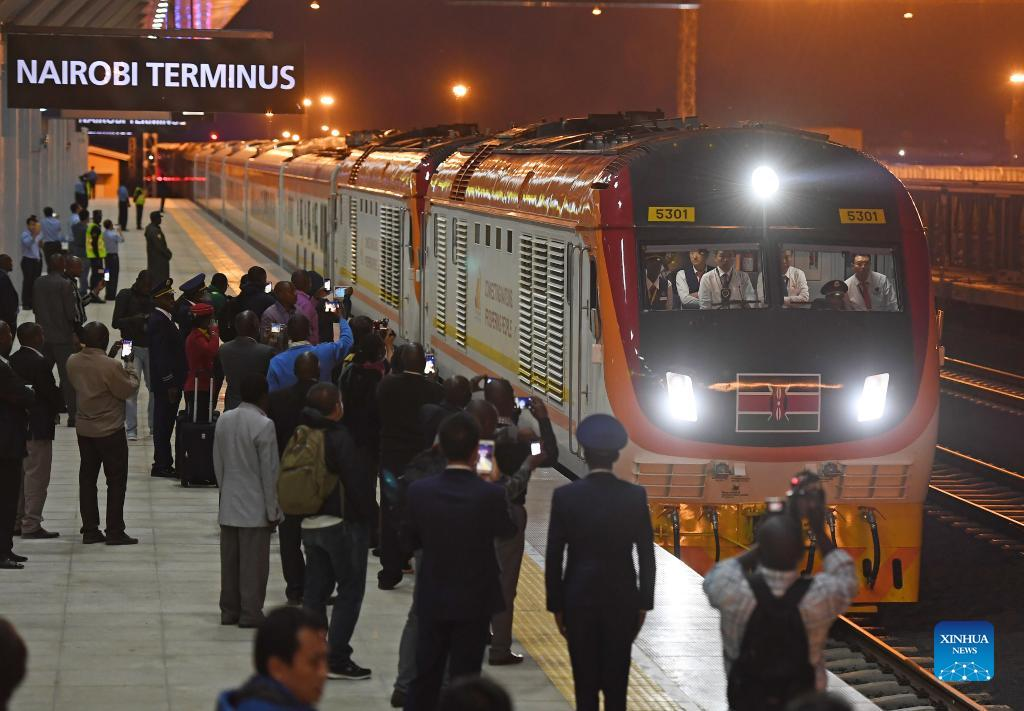 The first train of the Mombasa-Nairobi Standard Gauge Railway (SGR) arrives at Nairobi Terminus in Nairobi, Kenya, May 31, 2017. Kenya has now found a new lifeline in the Chinese-built Standard Gauge Railway (SGR) since its launch on May 31, 2017. Data from Afristar, the SGR operator, show the modern railway has transported more than 7.7 million passengers in the last five years. (Xinhua/Chen Cheng)
