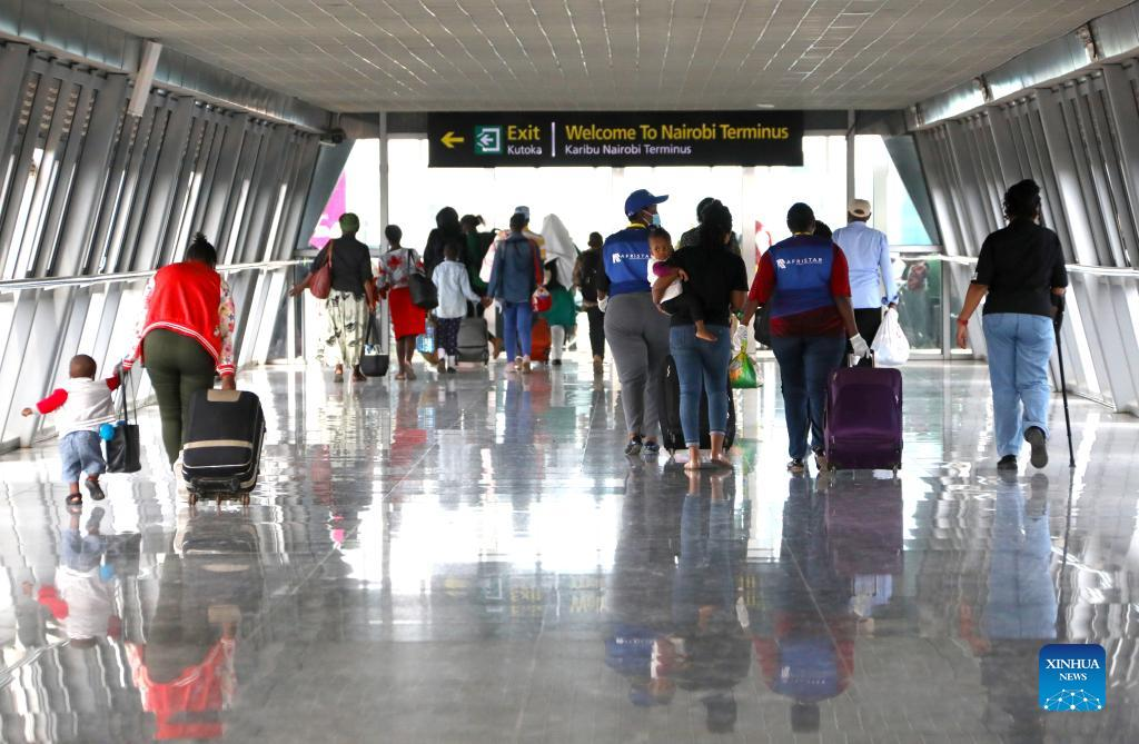 People leave Nairobi Station after getting off the train of the Mombasa-Nairobi Standard Gauge Railway (SGR) in Nairobi, Kenya, Nov. 17, 2021. Kenya has now found a new lifeline in the Chinese-built Standard Gauge Railway (SGR) since its launch on May 31, 2017. Data from Afristar, the SGR operator, show the modern railway has transported more than 7.7 million passengers in the last five years. (Xinhua/Dong Jianghui)