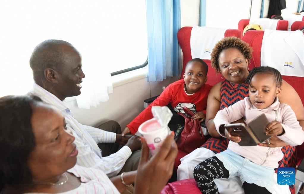 Passengers take a train from Nairobi to Mombasa along the Mombasa-Nairobi Standard Gauge Railway (SGR) in Kenya, June 9, 2017. Kenya has now found a new lifeline in the Chinese-built Standard Gauge Railway (SGR) since its launch on May 31, 2017. Data from Afristar, the SGR operator, show the modern railway has transported more than 7.7 million passengers in the last five years. (Xinhua/Li Baishun)