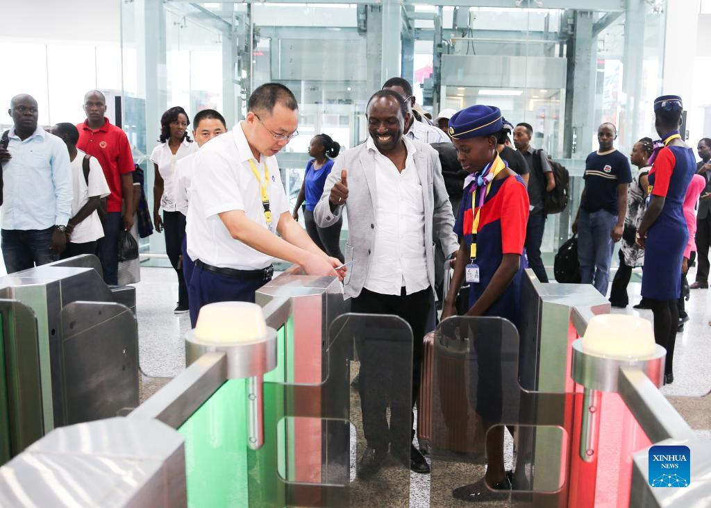 Staff members guide as a passenger passes a fare gate at Mombasa Terminus of the Mombasa-Nairobi Standard Gauge Railway (SGR) in Kenya, June 1, 2017. Kenya has now found a new lifeline in the Chinese-built Standard Gauge Railway (SGR) since its launch on May 31, 2017. Data from Afristar, the SGR operator, show the modern railway has transported more than 7.7 million passengers in the last five years. (Xinhua/Pan Siwei)
