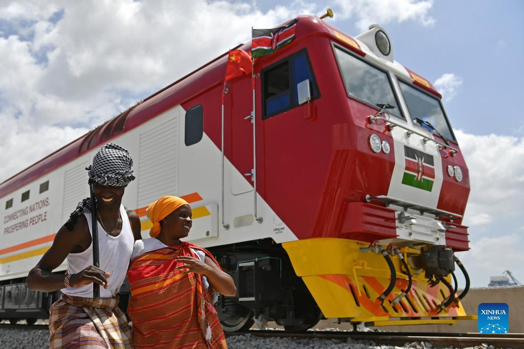 Kenyans sing and dance beside one of the first batch of locomotives for the Mombasa-Nairobi Standard Gauge Railway (SGR) in Mombasa, Kenya, Jan. 11, 2017. Kenya has now found a new lifeline in the Chinese-built Standard Gauge Railway (SGR) since its launch on May 31, 2017. Data from Afristar, the SGR operator, show the modern railway has transported more than 7.7 million passengers in the last five years. (Xinhua/Sun Ruibo)