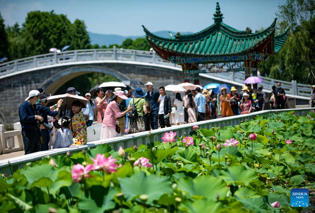 Visitors enjoy lotus flowers at Daguan Park in Kunming, southwest China's Yunnan Province, July 6, 2022.