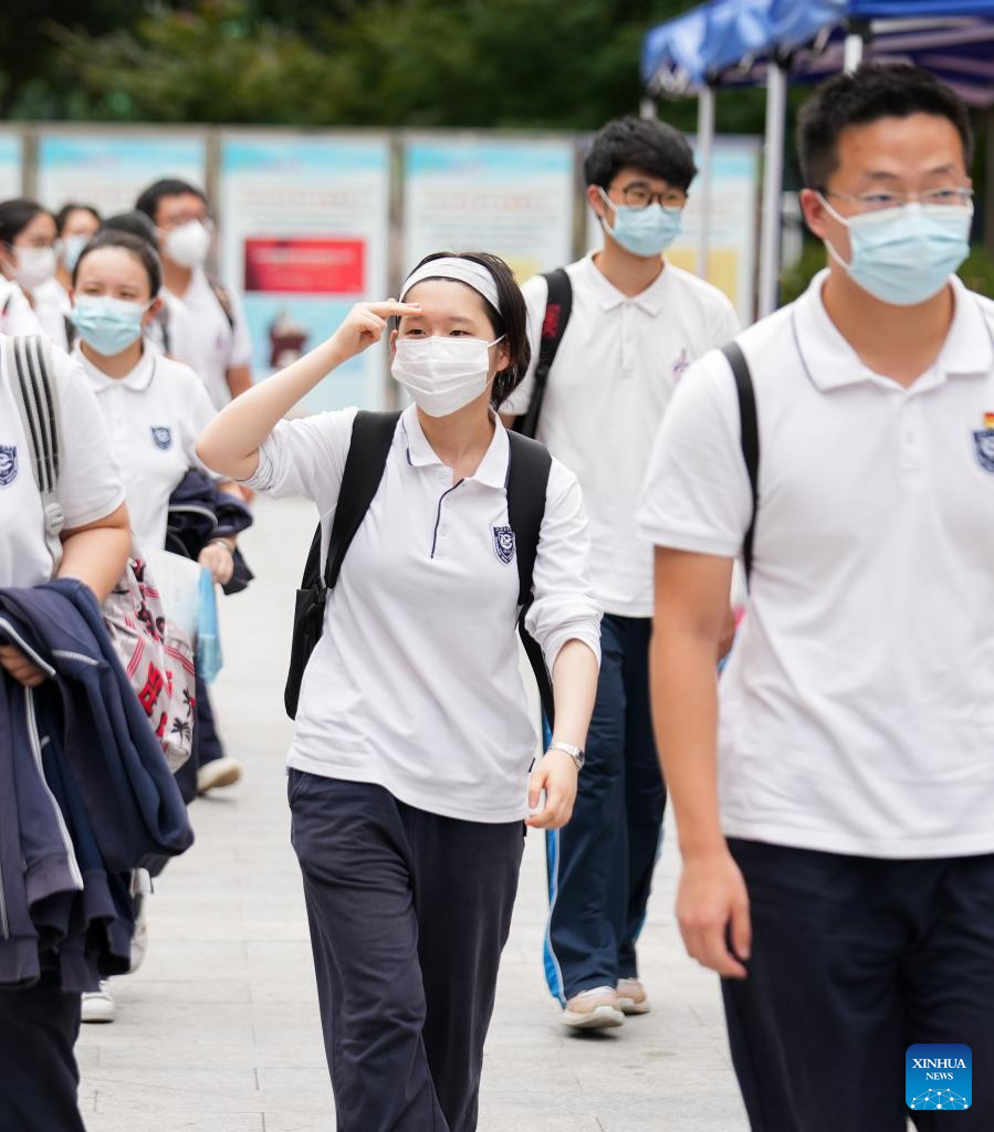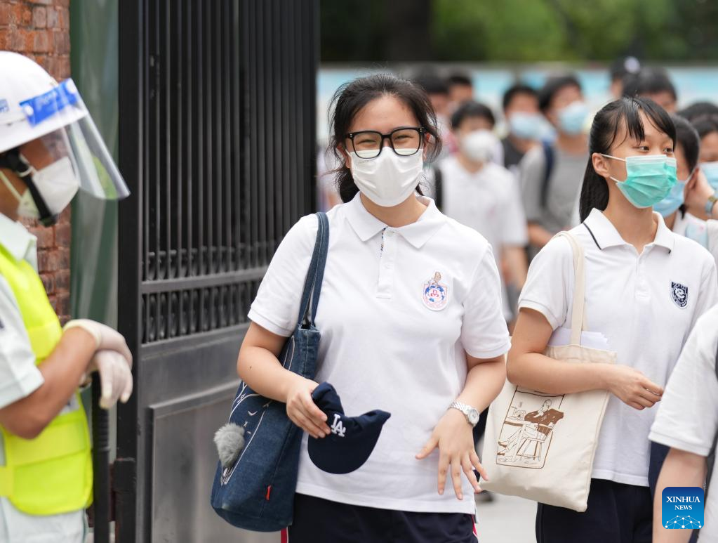 Examinees walk out of an exam site at Xuhui High School in east China's Shanghai, July 7, 2022.