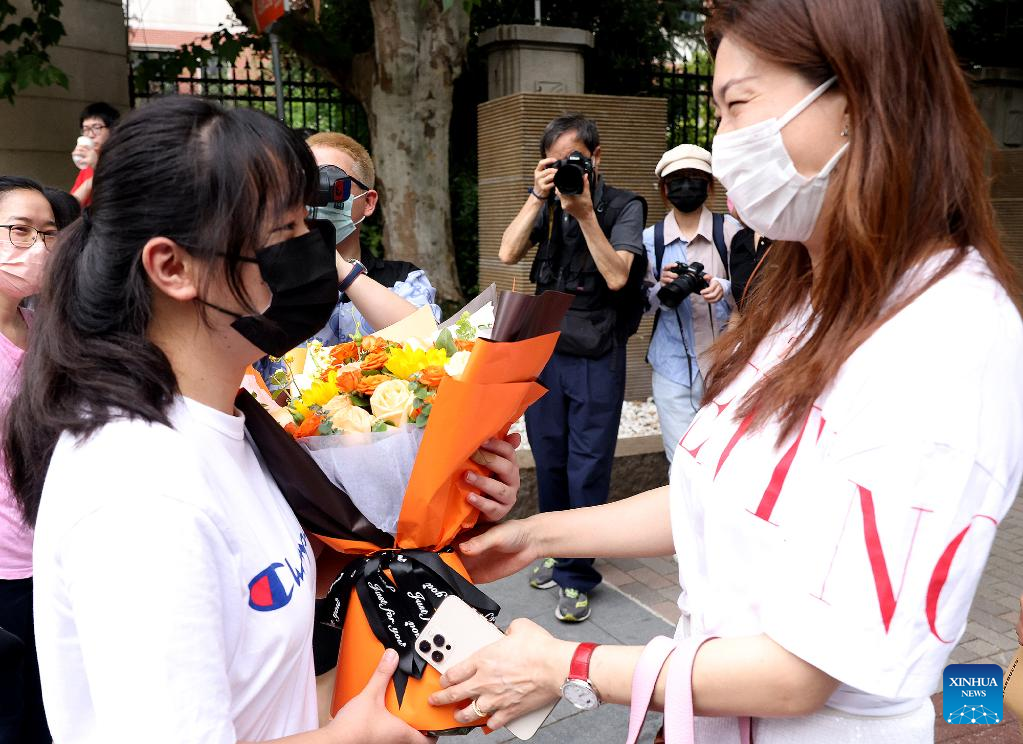 A woman brings flowers to her daughter who walks out of an exam site at Shixi High School in east China's Shanghai, July 7, 2022.