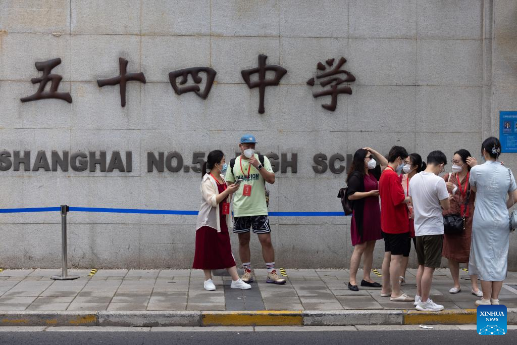 Examinees prepare for the exams outside an exam site at Nanyang Model High School in east China's Shanghai, July 7, 2022.