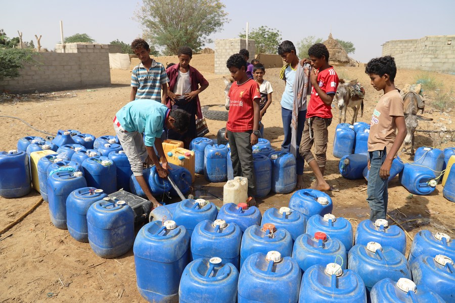 Yemeni children wait to fill their plastic tanks with water at a charitable water station in Abs District, Hajjah province, Yemen, on March 21, 2022. (Photo by Mohammed Al-Wafi/Xinhua)