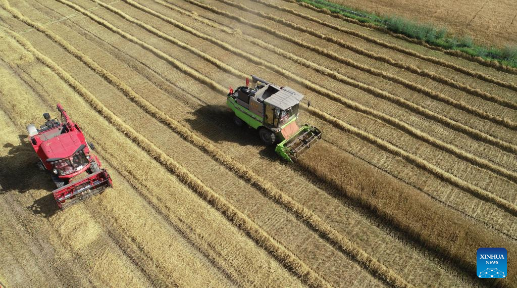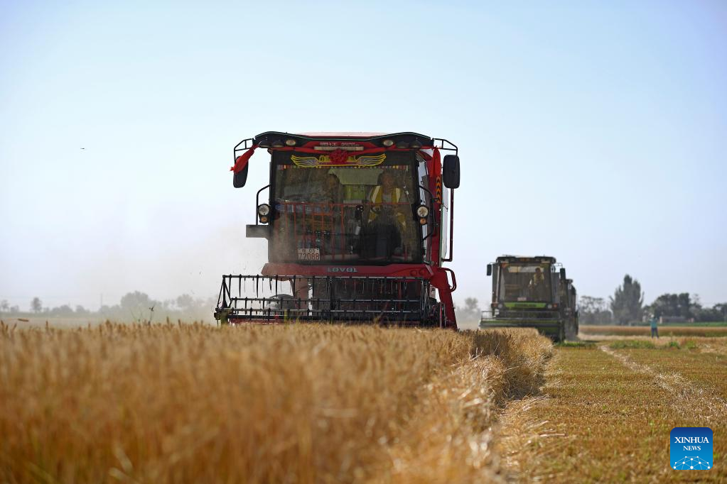 - Xinjiang farmers busy reaping winter wheat with mechanized harvesters
