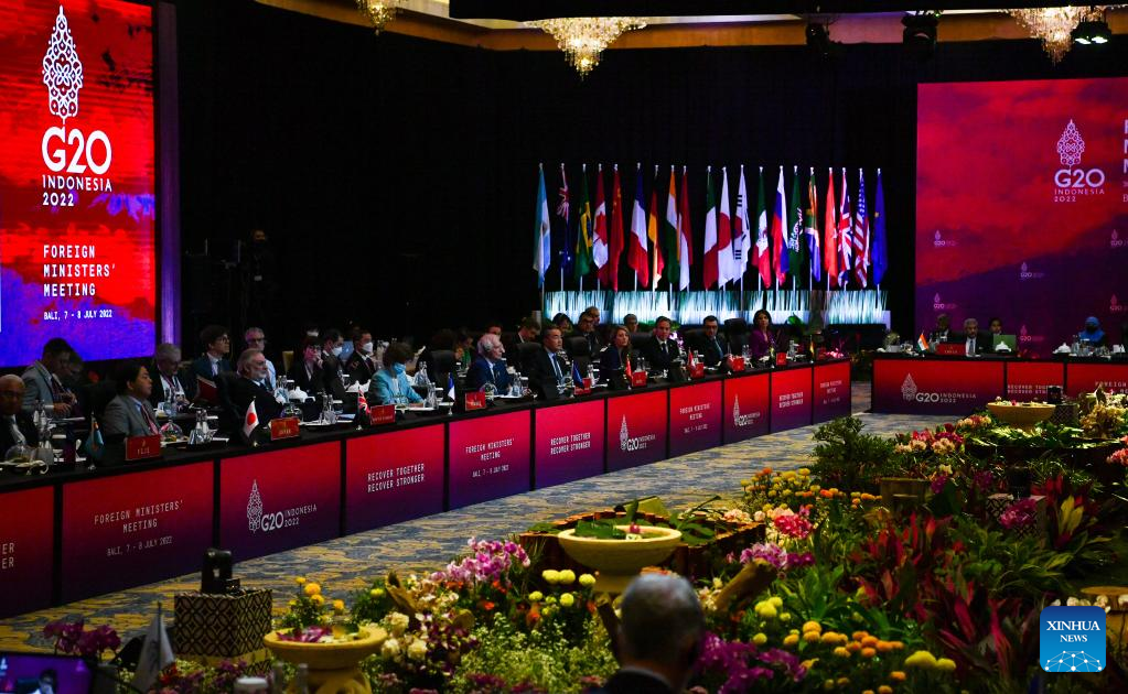 Chinese State Councilor and Foreign Minister Wang Yi (C) attends the Group of 20 (G20) foreign ministers' meeting in Bali, Indonesia, on July 8, 2022. (Xinhua/Xu Qin)