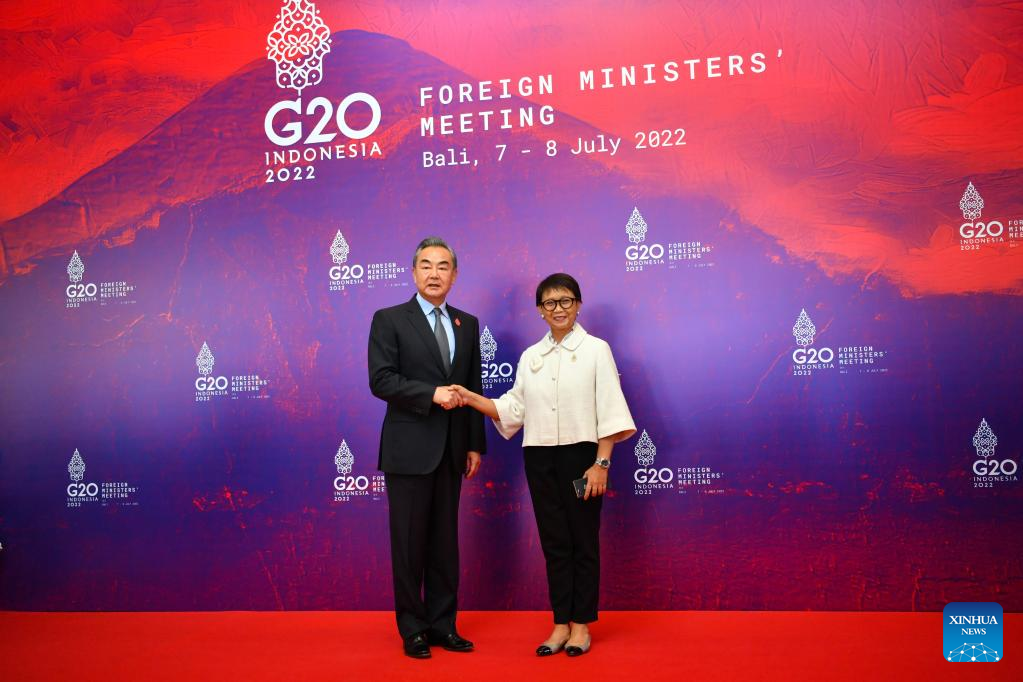 BALI, Indonesia, July 8 (Xinhua) -- Chinese State Councilor and Foreign Minister Wang Yi on Friday called for upholding true multilateralism, conducting win-win cooperation, and achieving inclusiveness and connectivity within the framework of the Group of 20 (G20).