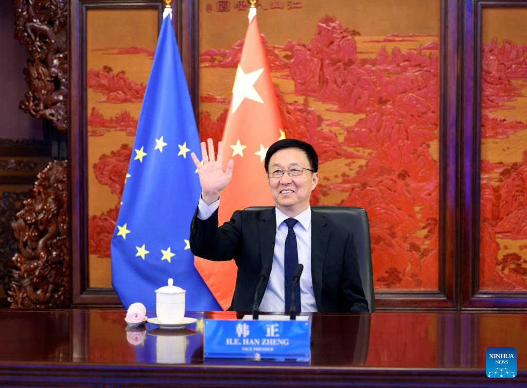 Han, also a Standing Committee member of the Political Bureau of the Communist Party of China Central Committee, said that the two sides should make full use of the high-level dialogue platform to further implement the consensus reached by their leaders and promote the deepening of the China-EU green partnership.