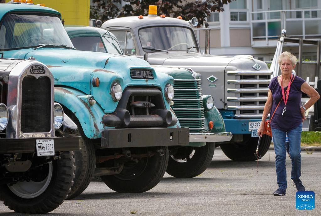 A woman walks past vintage trucks displayed during the National Truck Show in Surrey, British Columbia, Canada, on July 8, 2022. (Photo by Liang Sen/Xinhua)