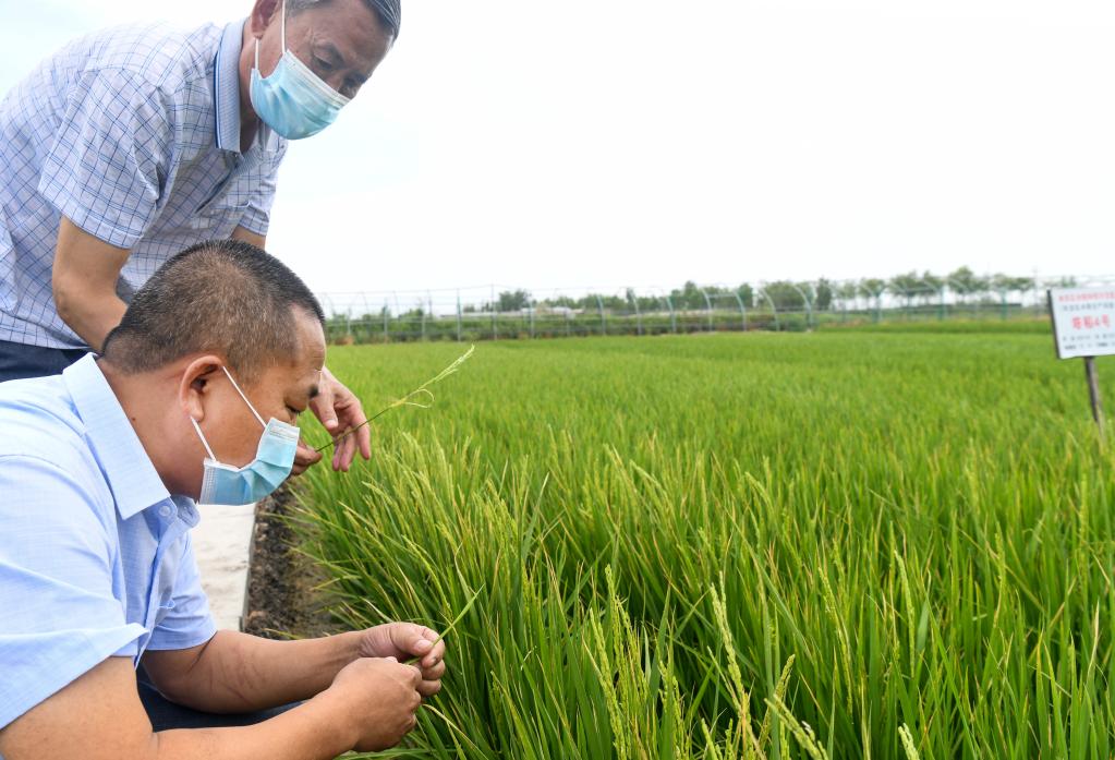 Researchers check the growth of rice at an agricultural science and technology demonstration base in Midong District, Urumqi, northwest China's Xinjiang Uygur Autonomous Region, July 5, 2022.