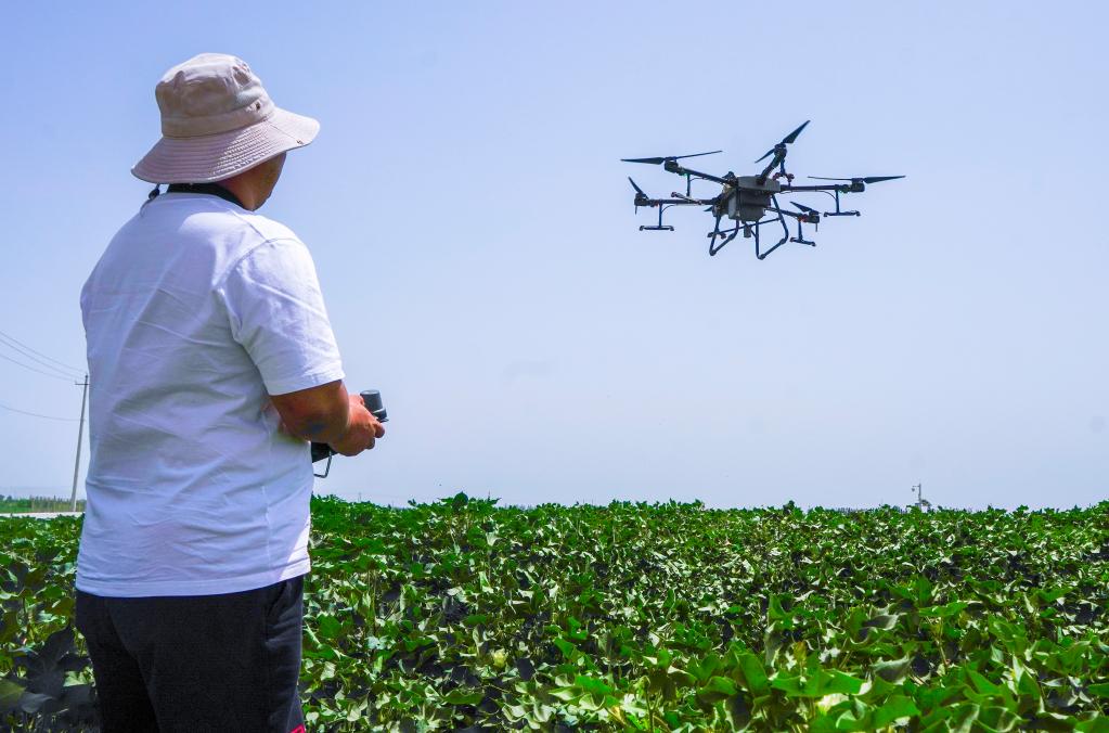 A villager flies a drone in a cotton field in Korla City, northwest China's Xinjiang Uygur Autonomous Region, July 6, 2022.