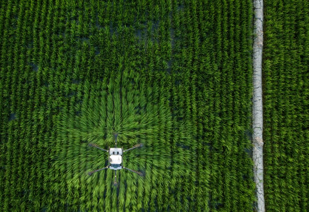 Aerial photo taken on July 4, 2022 shows a drone carrying out agricultural work in a rice paddy in Dujiazhuang Village, Sandaoba Township, Midong District, Urumqi, northwest China's Xinjiang Uygur Autonomous Region.